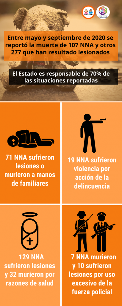 Entre mayo y septiembre de 2020 se reporta la muerte de 107 NNA y otros 277 que han resultado lesionados y, aunque las muertes y lesiones producto de la acción deliberada de desconocidos o familiares de NNA representan menos de 30% de las situaciones registradas, no deja de ser alarmante la intensidad y las formas de violencia. 71 NNA sufrieron lesiones o murieron a manos de familiares, principalmente niños y niñas entre 0 y 10 años de edad.