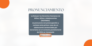 La Red por los Derechos Humanos de Niños, Niñas y Adolescentes (REDHNNA) se pronuncia con preocupación y rechazo ante primer caso de un adolescente sentenciado por terrorismo en el contexto postelectoral de 2024 en Venezuela La condena impuesta a Gabriel José Rodríguez Méndez constituye el primer caso documentado, en el contexto postelectoral de 2024, en el … Sigue leyendo Pronunciamiento de la REDHNNA ante primer caso de un adolescente sentenciado por terrorismo en el contexto postelectoral de 2024 en Venezuela
