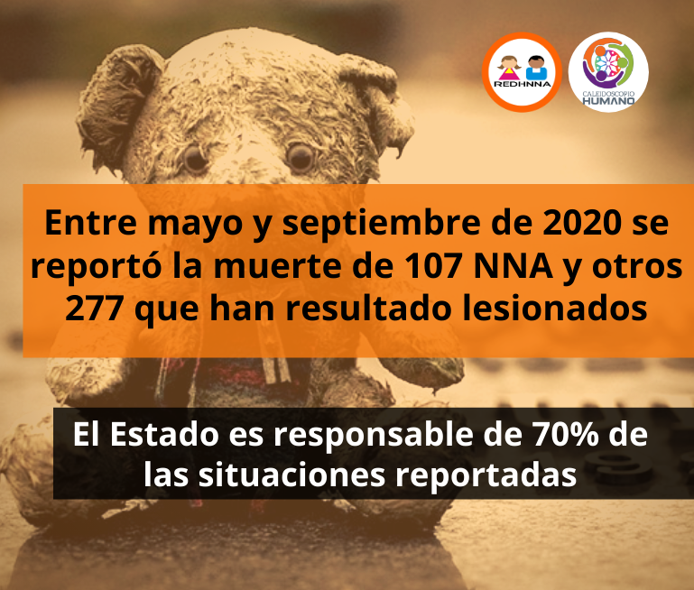 Entre mayo y septiembre de 2020 se reporta la muerte de 107 NNA y otros 277 que han resultado lesionados y, aunque las muertes y lesiones producto de la acción deliberada de desconocidos o familiares de NNA representan menos de 30% de las situaciones registradas, no deja de ser alarmante la intensidad y las formas de violencia. 71 NNA sufrieron lesiones o murieron a manos de familiares, principalmente niños y niñas entre 0 y 10 años de edad.