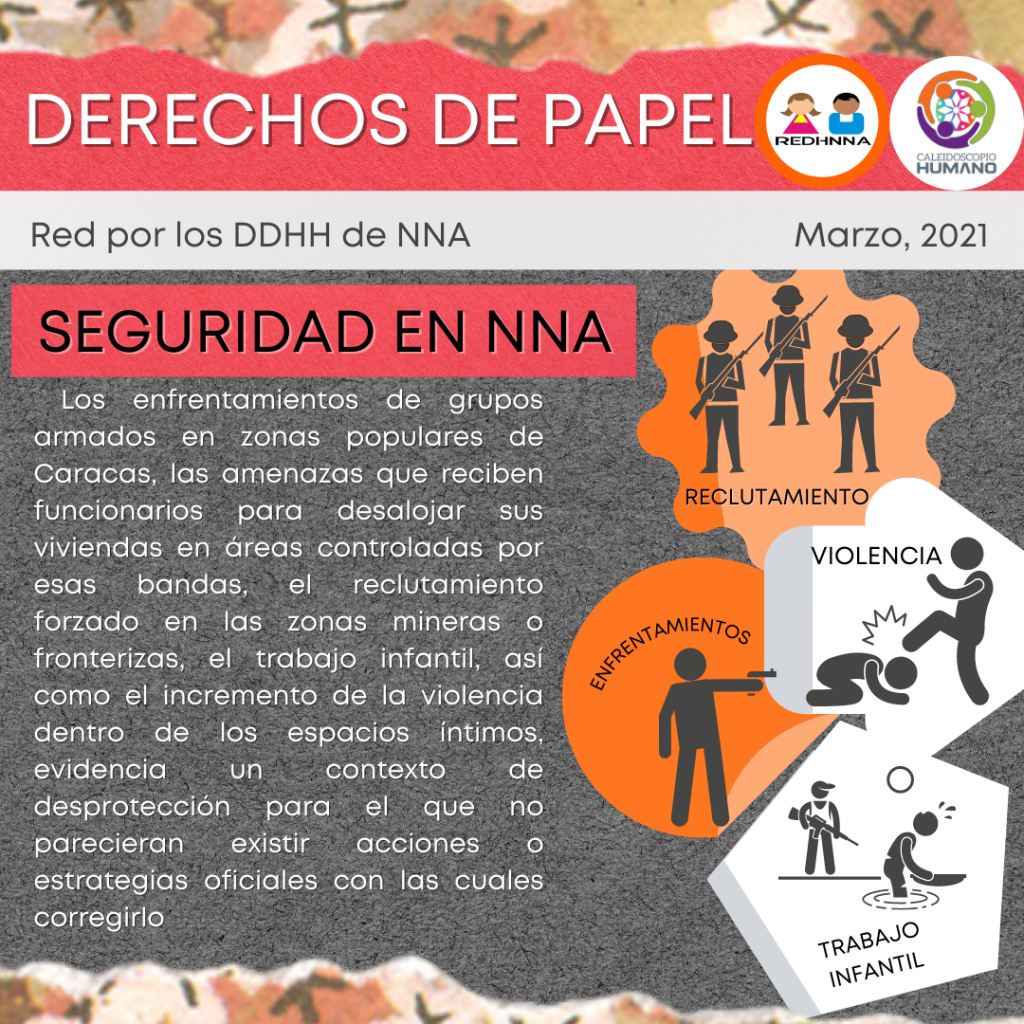 En enero se reseñaron por lo menos 14 situaciones de seguridad que afectan a NNA, 5 de ellas involucran secuestro o desaparición. Los enfrentamientos de grupos armados en zonas populares de Caracas, las amenazas que reciben funcionarios para desalojar sus viviendas en áreas controladas por esas bandas, el reclutamiento forzado en las zonas mineras o fronterizas, el trabajo infantil, así como el incremento de la violencia dentro de los espacios íntimos, evidencia un contexto de desprotección para el que no parecieran existir acciones o estrategias oficiales con las cuales corregirlo.