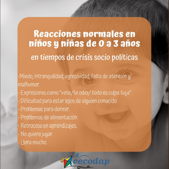La crisis económica y humanitaria que afecta a Venezuela crece día a día, y los niños no son exentos de ella. Carlos Trapani, coordinador general de Cecodap, señala que -frente a situaciones como la que viven los venezolanos actualmente- lo ideal es “proteger a los niños. Garantizarles recreación, educación, contacto con sus familiares“. Trapani señala que es vital que los niños tengan acompañamiento y sean informados acerca de la crisis, así como todas sus implicaciones.
