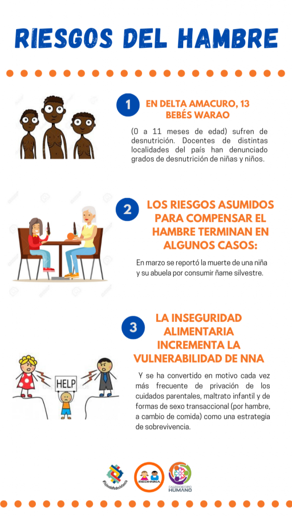 A pesar del esfuerzo de ONG venezolanas y organismos internacionales, solo en febrero se contabilizaron en los estados Amazonas y Delta Amacuro 840 NNA bajos de talla y peso, mientras que 640 estaban en riesgo de desnutrición. En Delta Amacuro, 13 bebés warao (0 a 11 meses de edad) sufren de desnutrición. Docentes de distintas localidades del país han denunciado grados de desnutrición de niñas y niños.