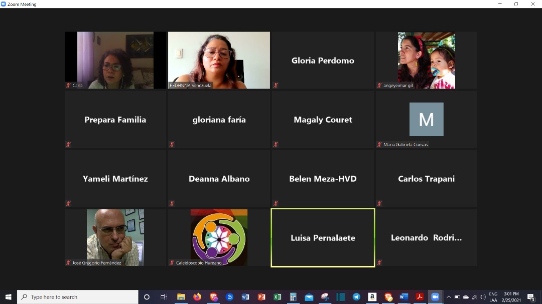Aldeas SOS Venezuela, Asoc. Muchachos de la Calle; Caleidoscopio Humano; CECODAP; CENDIF-UNIMET; Fe y Alegría; Fundación Luz y Vida; Hogar Virgen de los Dolores; IIJ-UCAB; Prepara familia; Proadopción; Red de Casas Don Bosco y las defensoras Lorena Liendo y Angeyeimar Gil asistieron a la reunión para compartir las distintas preocupaciones en materia de derechos humanos de NNA, presentar propuestas y reportes del trabajo realizado en 2020 que con la pandemia y la profundización de la emergencia humanitaria compleja ha dejado latente distintos retos para el trabajo articulado del año actual.
